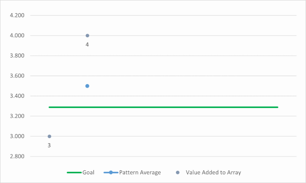 Next, the function creates an 1D array containing the lower and upper bound and then takes the average of that array. If the average of the array (average of the takt time pattern) is lower than the goal takt time, the upper bound value is added to the array and the average is recalculated. If the average takt time of the pattern is above the goal takt time, the lower bound value is added to the array and the average is recalculated. Here is an animation describing that process: