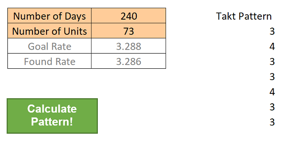 How it works: First, this function begins by calculating the goal takt time. This is simply the days divided by the number of units to be built. Once the goal takt time is established, the function uses the goal takt time to set up the lower and upper bounds. To keep the repeating pattern as uniform as possible, the upper and lower bound are the integers directly above and below the goal takt time.